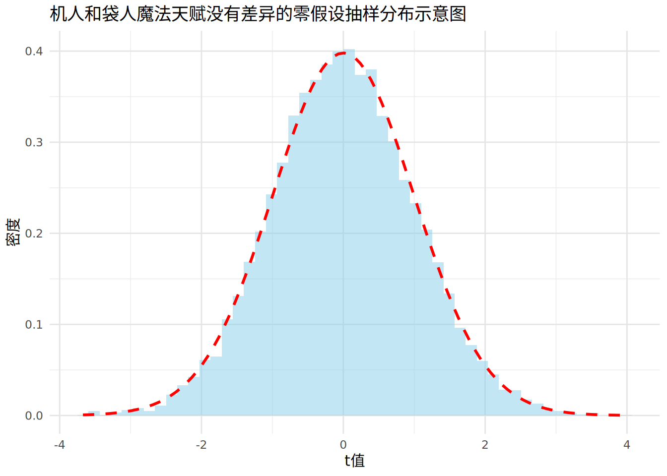 上面的图就是当机人和袋人魔法天赋一样这个零假设成立时,t值的抽样分布了。换句话说,就是如果机人和袋人真的魔法天赋一样,那我们反复地各抽五十个人作为样本计算他们的均值之差,并计算他们的频次,只要抽的次数足够多,就会形成上面的图(上面图里的蓝色直方图就是我们抽了一万次的结果)。在这个图里,t值对应的密度,也就是红色虚线的纵坐标越大,意味着这个t值在抽样中出现的概率越高。所以我们可以看出,集中在均值,也就是t=0(对应μ 袋 人 − μ 机 人 = 0 \mu_{袋人}-\mu_{机人}=0 )极其附近的区域在多次抽样后的发生概率最高。