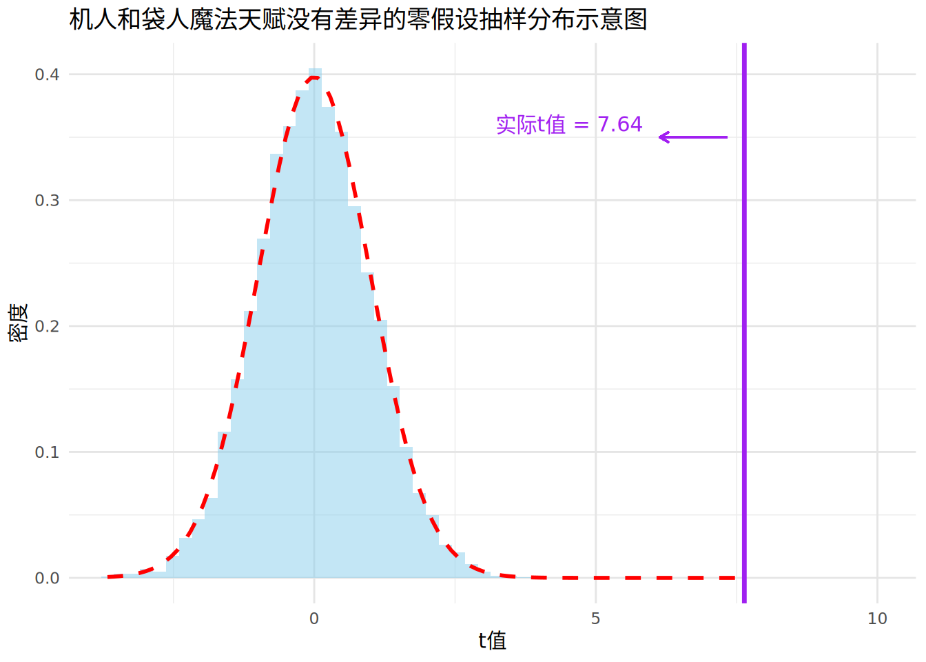 看看紫色对应的t值在t分布中的位置!显然它距离均值已经非常遥远,对应的红色虚线纵坐标也非常接近于0。换句话说,如果机人和袋人真的魔法天赋一样的话,我们进行一次抽样,结果是这个t值的可能性非常接近于0。