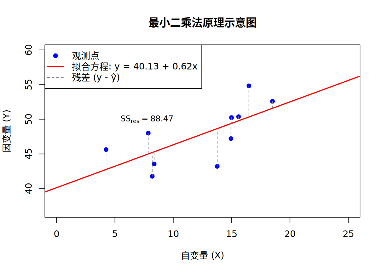 考虑距离为离均差的话,离均差的平方 ,如果已知所有y的取值,试图找到让这个方程取值最小的x值,即二次函数顶点,↩︎
