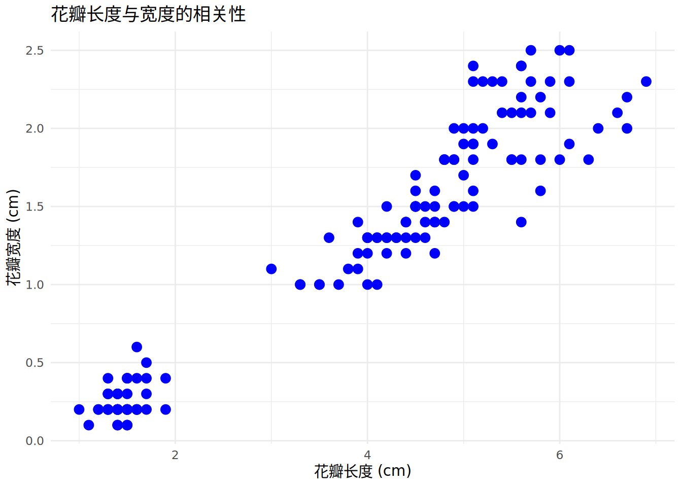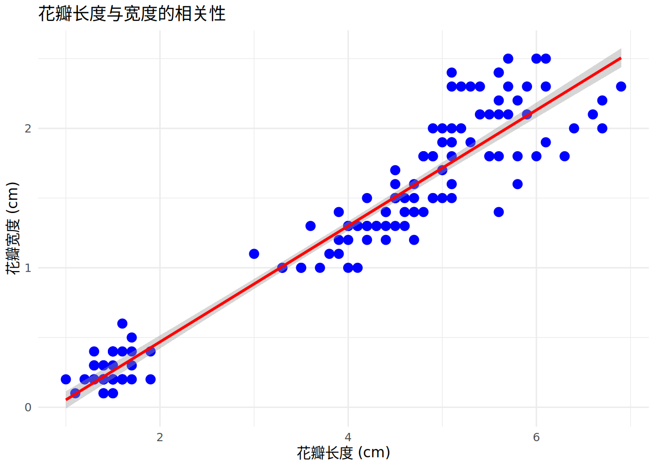 不过当我们放到皮尔逊相关这个角度去摸这只大象时,不妨回忆一下,如果我们坐在统计的课堂上,当老师讲解这个概念时,使用的例子是什么样的。比如下面这个图,使用的就是鸢尾花的数据,呈现了花瓣长度(x轴)和花瓣宽度(y轴)之间的关系。见过花的读者应该都知道,这两个变量之间显然存在关系,在同一个物种上,花瓣不能光横着长或者竖着长。就好像在ppt里缩放图片,显然你得按住shift缩放才能保住花的真实感。所以,花的长度越长,一般宽度就越宽,反过来也一样。
