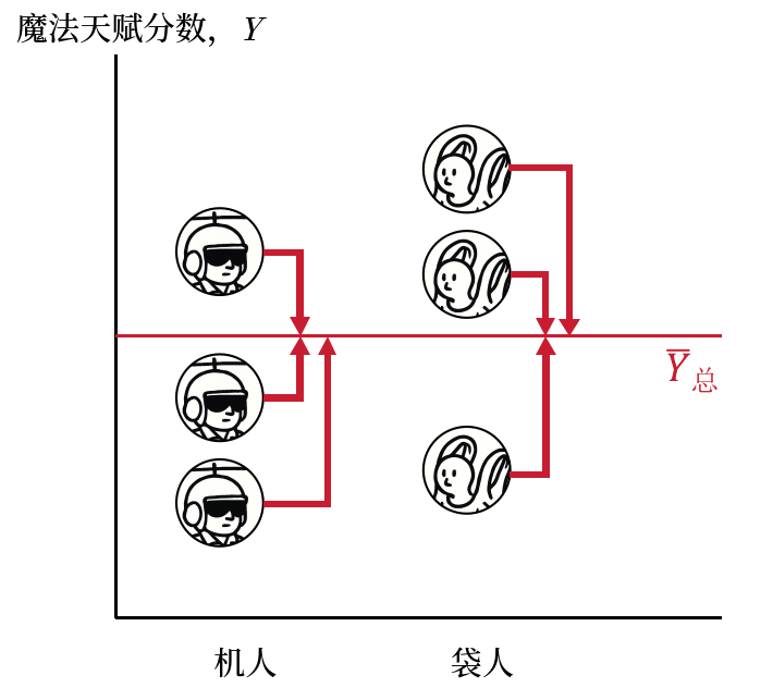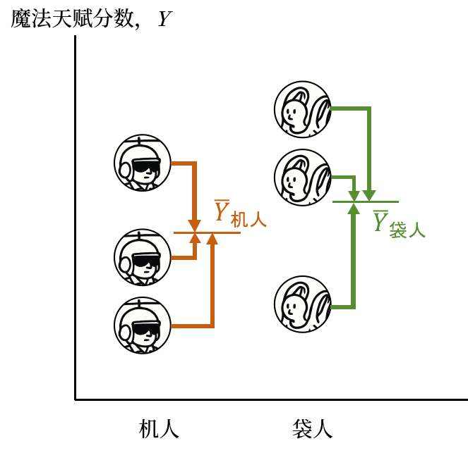 还记得我们对机人和袋人赋的x值吗?对,0和1。所以上面那个式子的分母就是1,斜率b1就是机人和袋人的魔法天赋分数的差值。检验它是否显著,就是在检验机人和袋人的平均魔法天赋分数的差异是否显著!